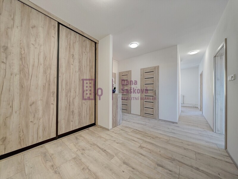 Interiér je vybavený vestavěnými šatními skříněmi a kuchyňskou linkou