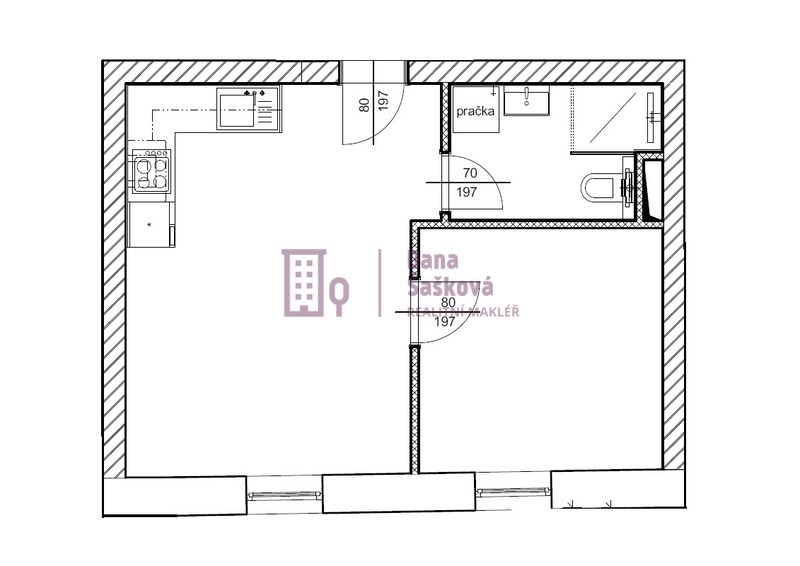 Podlahová plocha 39 m2 nabízí pokoj s kuchyňským koutem a koupelnu