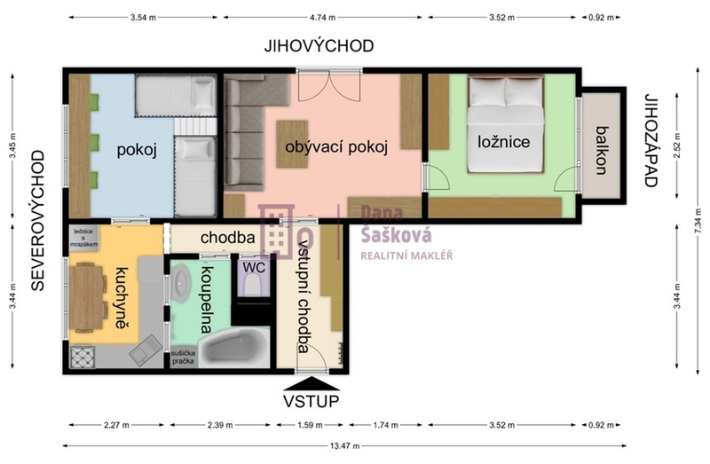 Dispozice 3+1 nabízí vstupní chodbu, ložnici se vstupem na balkon,