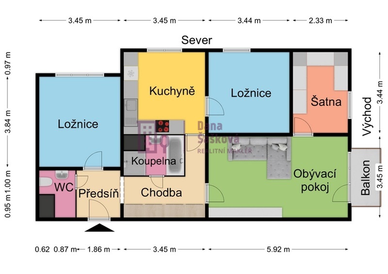 Dispozice 4+1 o celkové výměře 87 m2 nabízí předsíň, chodbu