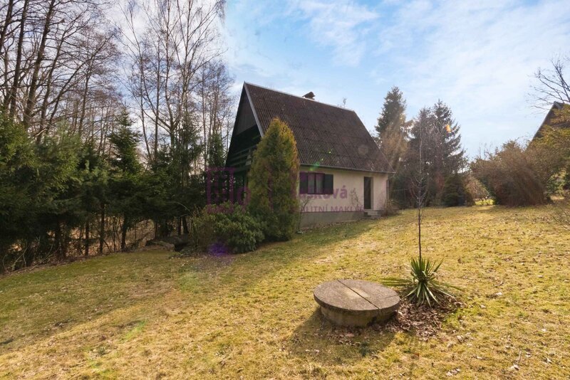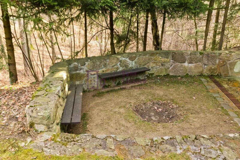 Před chatou se nachází posezení s ohništěm, pozemek je částečně
